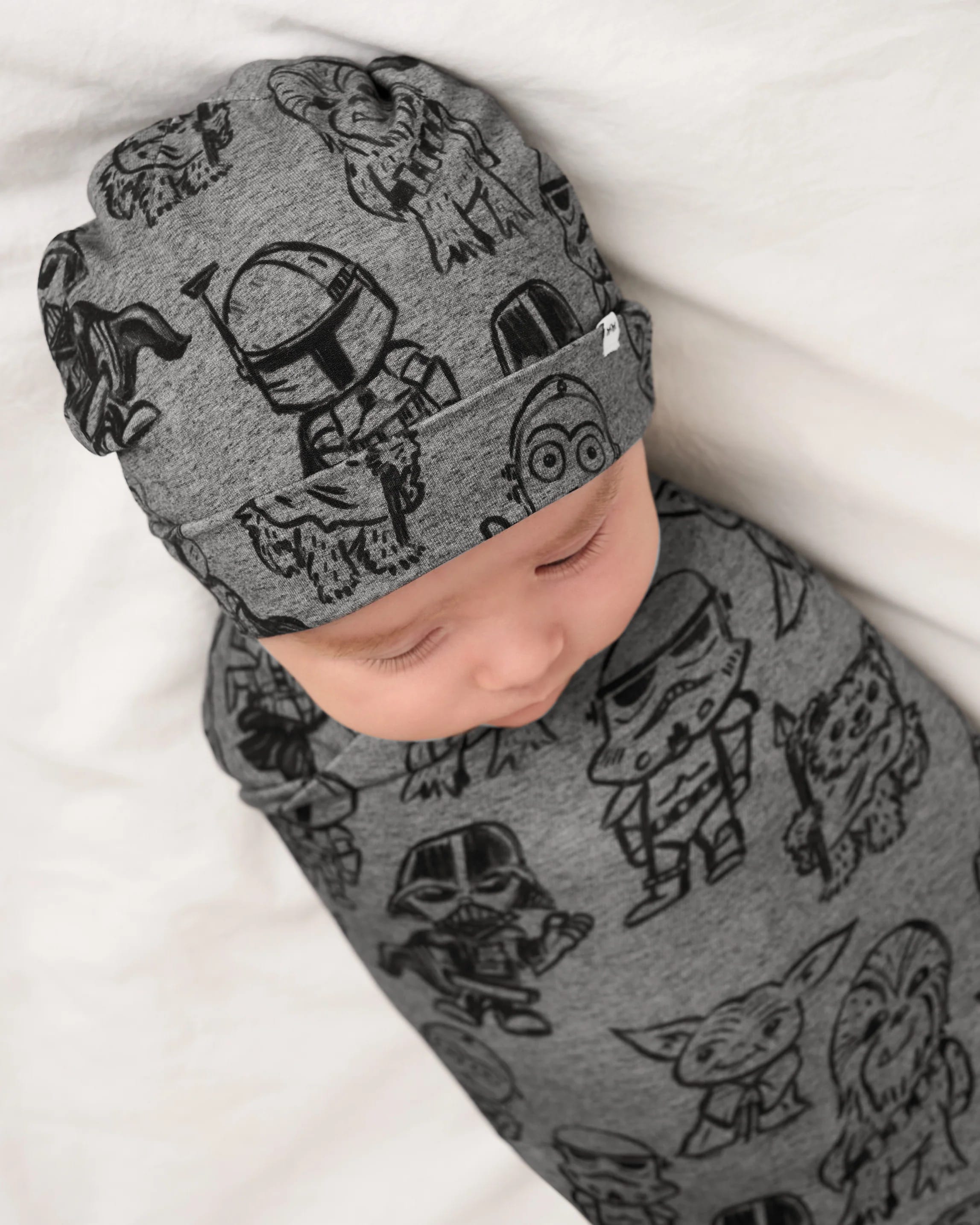Various outfits for newborns, toddlers, children, and adults. Same artwork across multiple items of tops and bottoms, with Boba Fett included in the design.