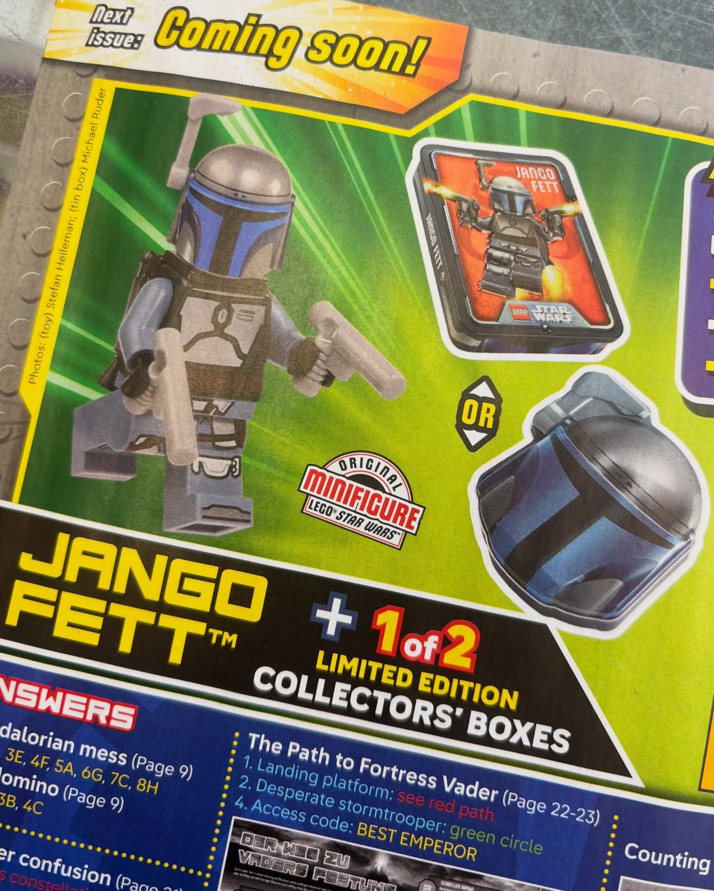 Includes a promo for the next issue (#135) having a Jango Fett exclusive – a minifig in one of two possible Jango Fett tin boxes.