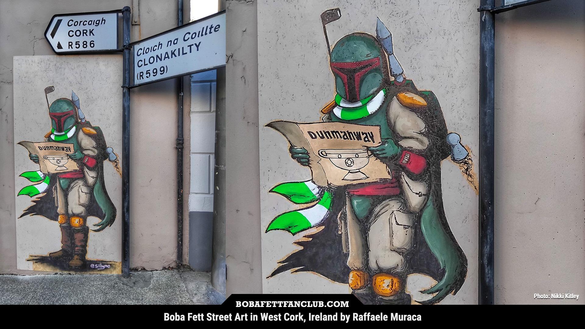 View on Tumblr | Mastodon | Bluesky#BobaFett street art in Dunmanway, West Cork, Ireland by Raffaele Muraca (https://www.instagram.com/sillyme_arts/) for their Feel the Force Festival