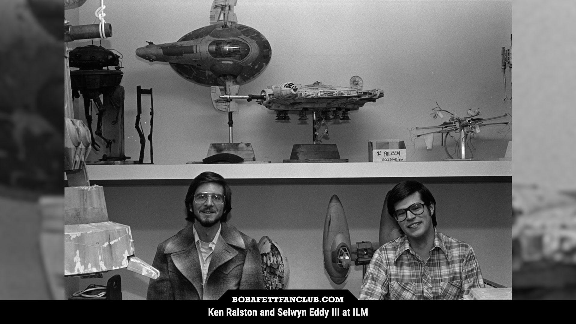 View on Tumblr | Mastodon | BlueskyVintage photo of Ken Ralston and Selwyn Eddy III at ILM with the studio scale Slave I prop just chillin' on the shelf