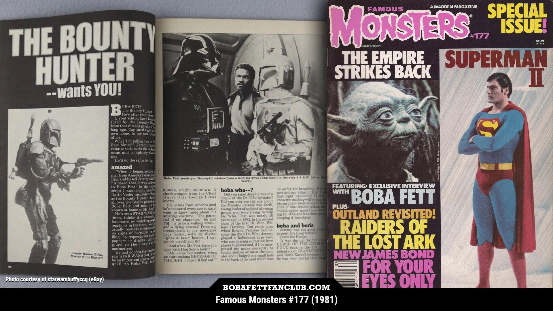 View on Tumblr | Mastodon | BlueskyFamous Monsters #177 (1981) featured a #BobaFett mention on the cover and a multi-page interview with Jeremy Bulloch inside